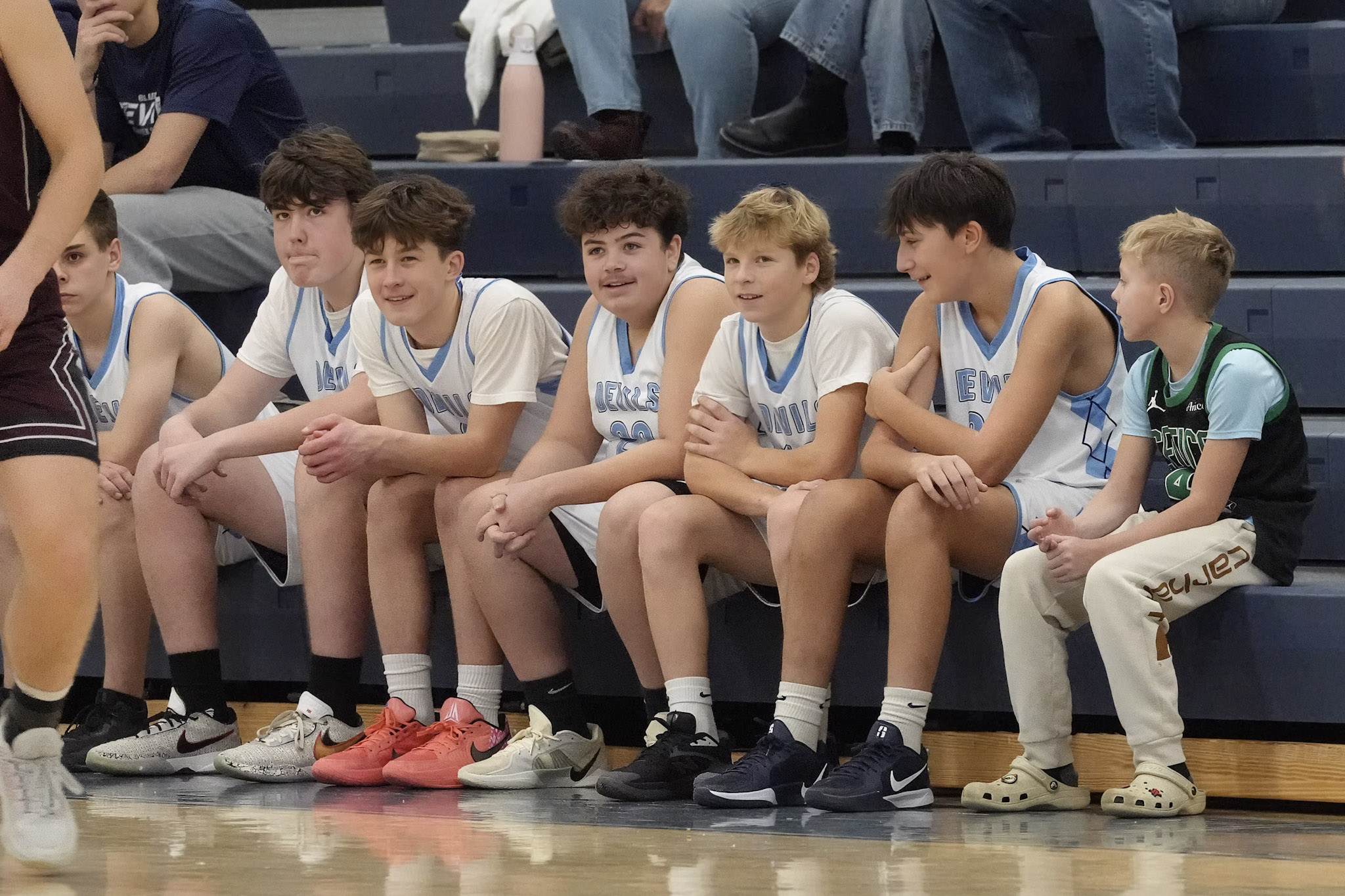 The junior varsity boys are all smiles as they enthusiastically support their teammates.