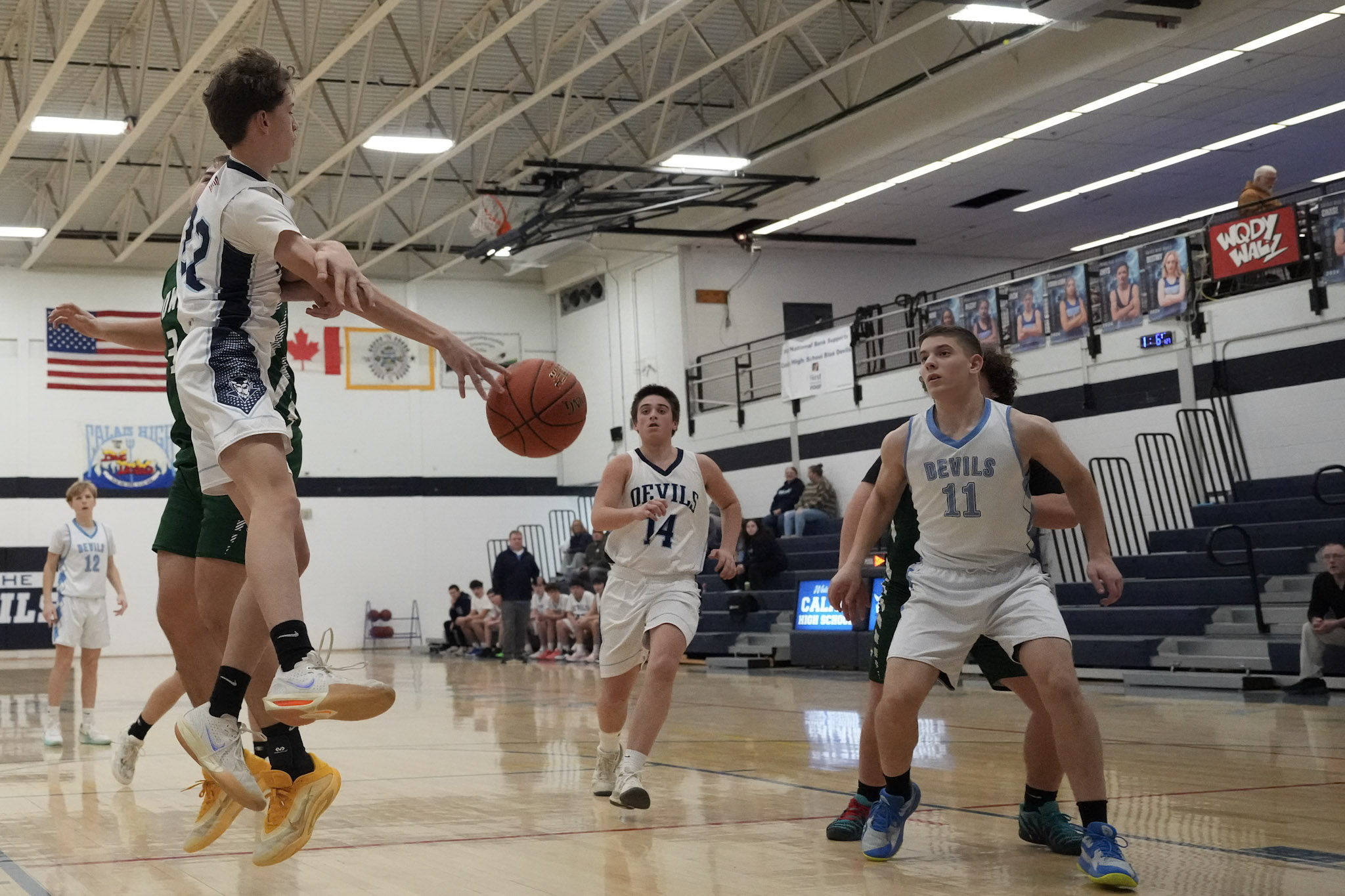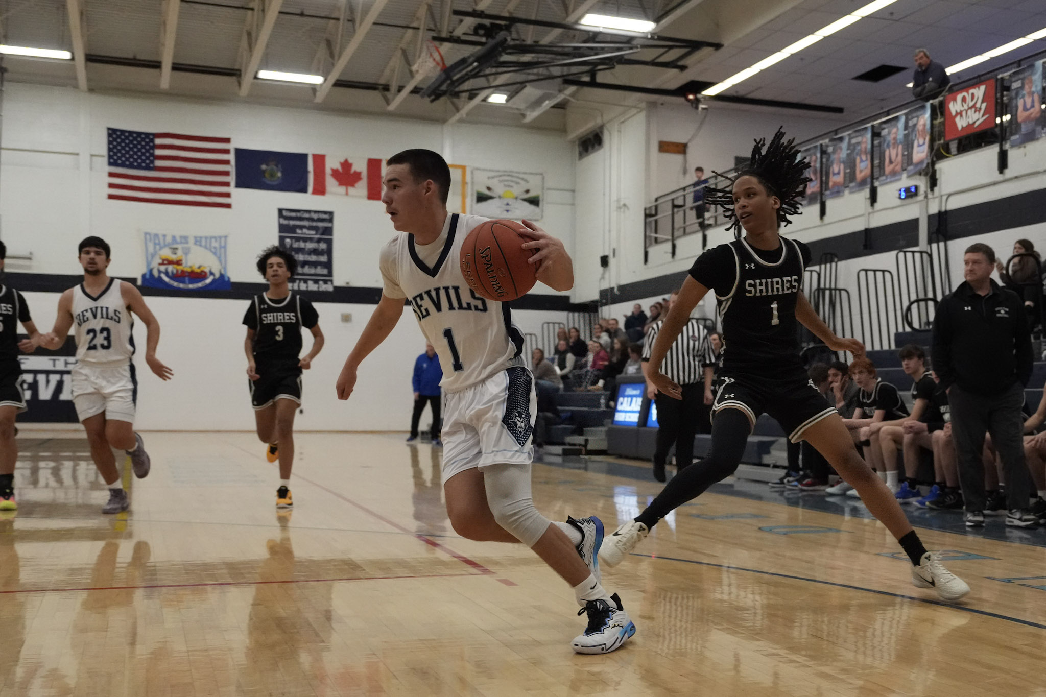 Isaac Downing dribbles the ball and makes a strong drive to the basket, scoring two points. Calais secured the win.