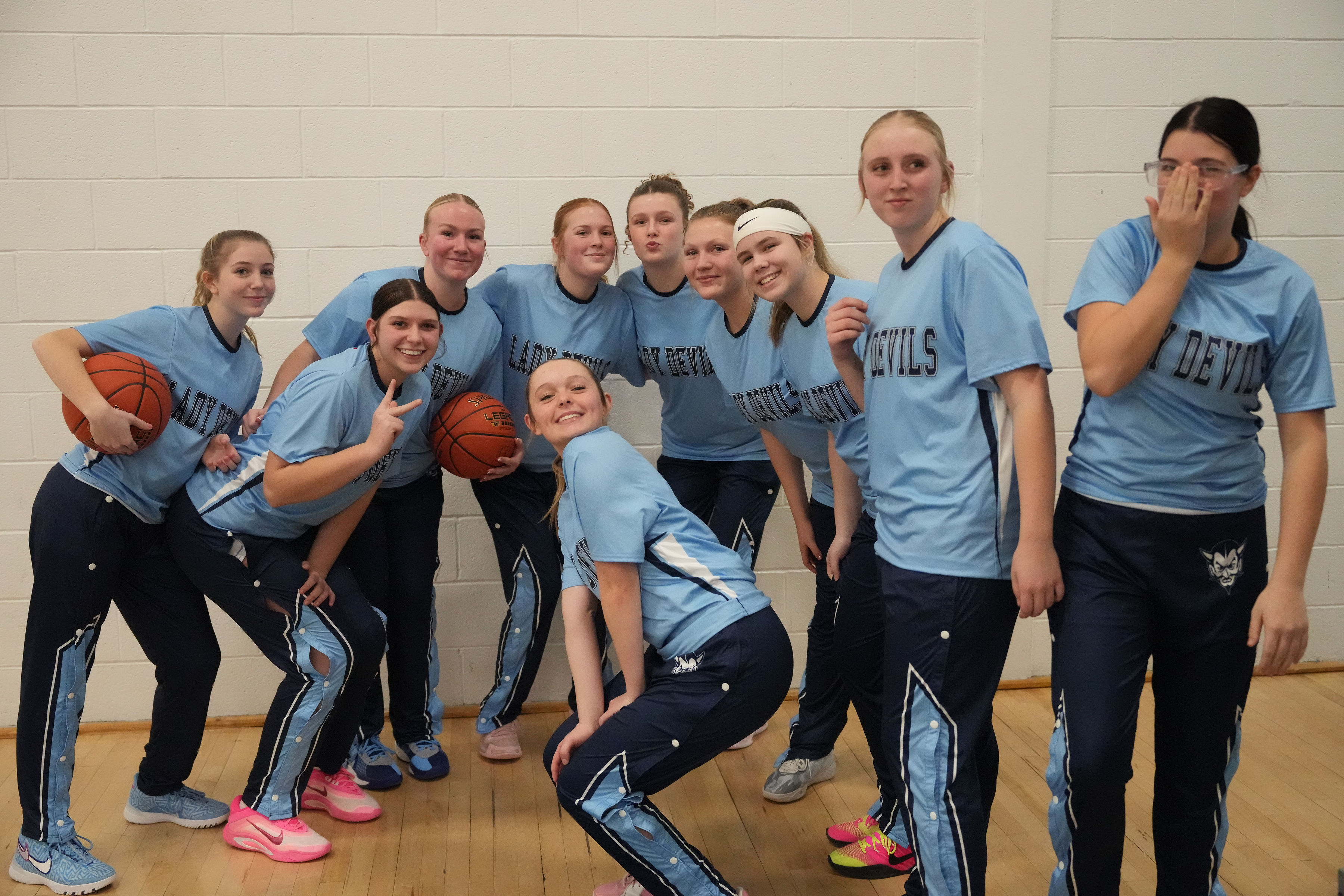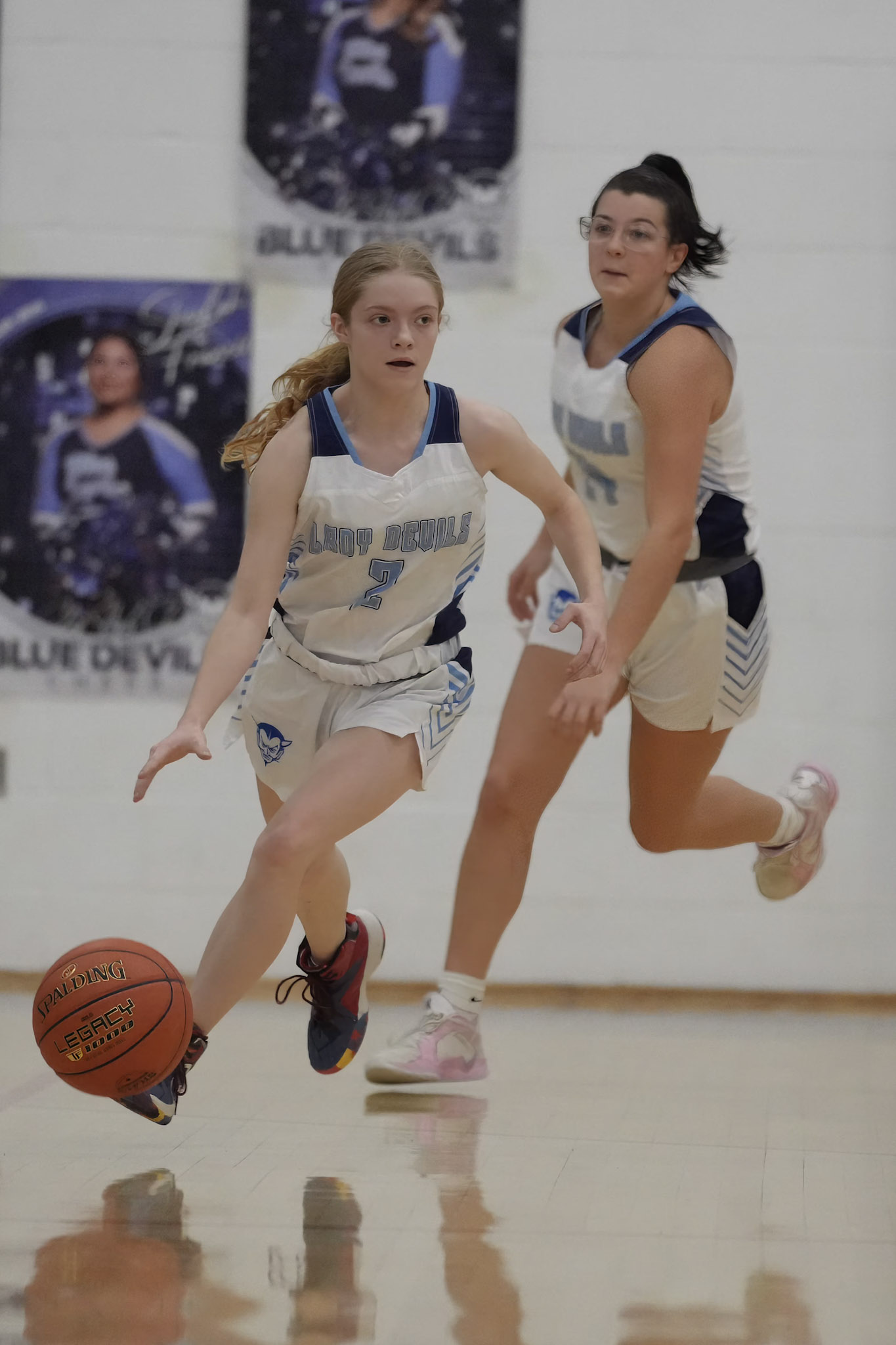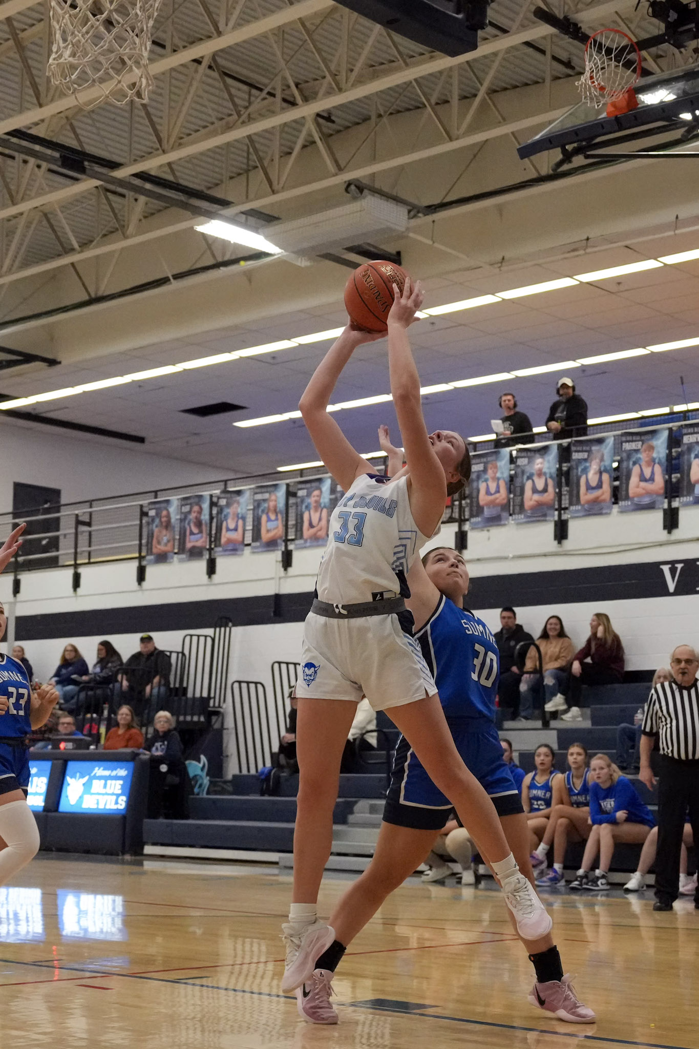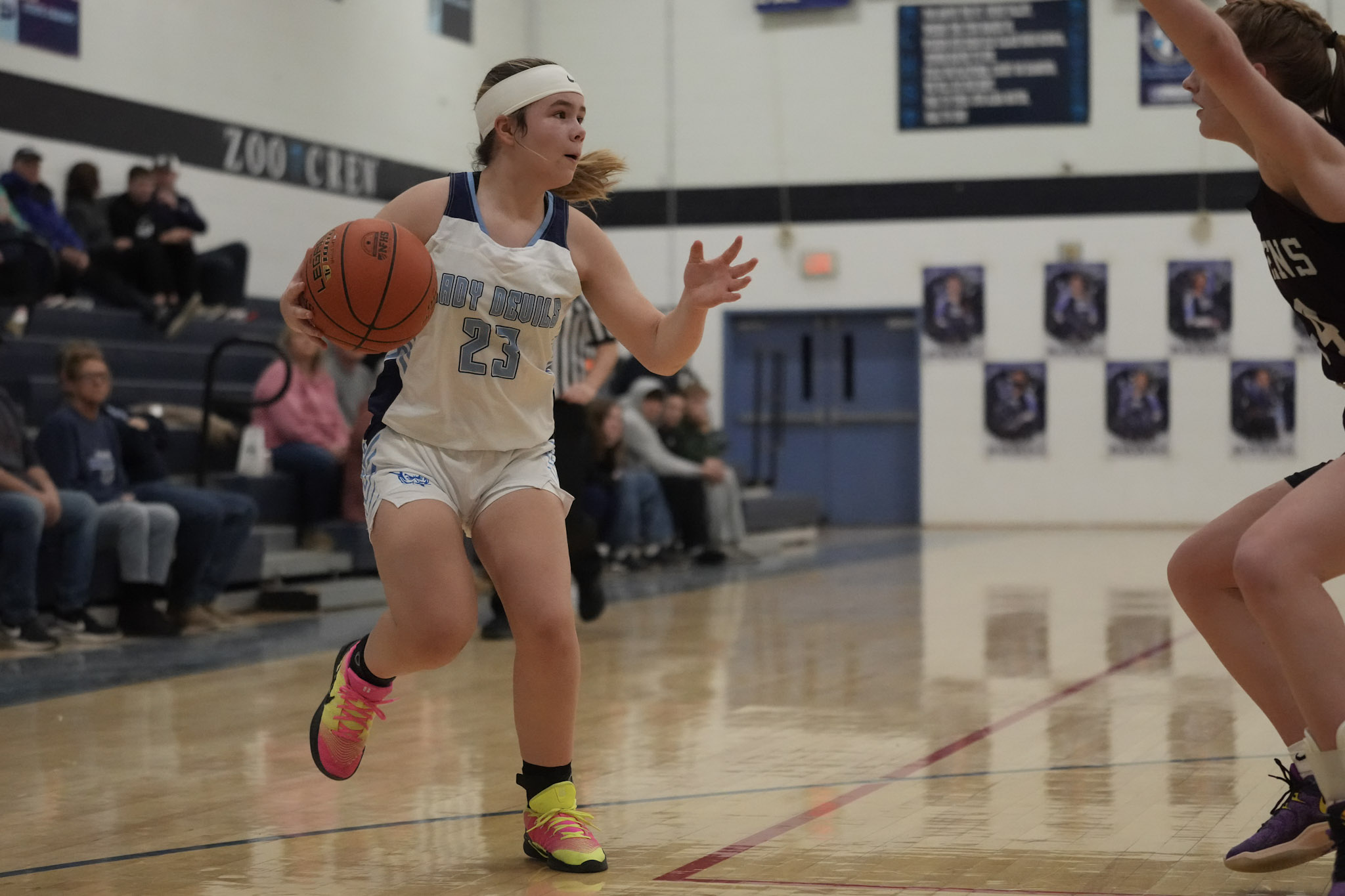 Sadie McPhee drives to the basket and scores two points, contributing to the Devils' victory.